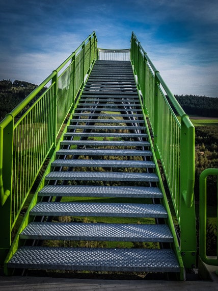 Nach kurzer Zeit sehen Sie rechts in einiger Entfernung bereits diese in auffälligem Grün lackierte Aussichtsplattform. Sie ist beeindruckend, ragt sich doch hoch und weit über die Kante und über das tief unten liegende Saaletal hinweg. Gehen Sie also auf dem geteerten Weg vor bis zur kleinen Kreuzung, biegen Sie nach rechts zur Aussichtsplattform ab und genießen Sie die grandiose Aussicht.